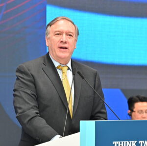 続いて、マイク・ポンペオ前米国務長官(=写真左)が登壇しました。ピルズベリー氏の基調講演と関連し、「トランプ政権でも、中国をどう理解するか、平和に対する中国の脅威をどう克服するか、多くの悩みを抱えていた」と述べ、ピルズベリー氏の見解に同意しました。ポンペオ氏は「米国と中国の覇権競争という言葉をよく聞くが、これは正確な表現ではない」とし、現在行われているのは国同士の戦いではなく、「世界が従うべきモデルに対する競争」という点を強調。中国の挑戦は人権、法の支配など普遍的な価値を守る問題、未来世代の「生き方」への挑戦と説明しました。また、ポンペオ氏は、気候変動、保健協力など今日の国際社会の危機にも中国が非協力的であることを挙げ、「(中国問題を解決する上で)韓国政府の役割が重要」という点を指摘しました。